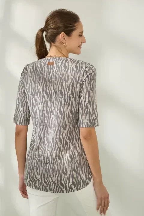 Confeccionada en jersey viscosa estampado, esta remera destaca por su caída suave y fresca.