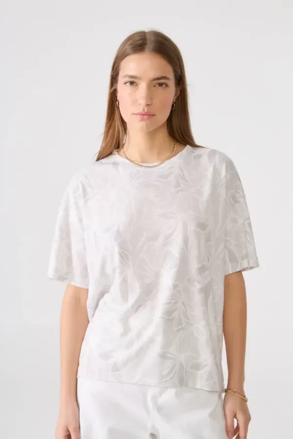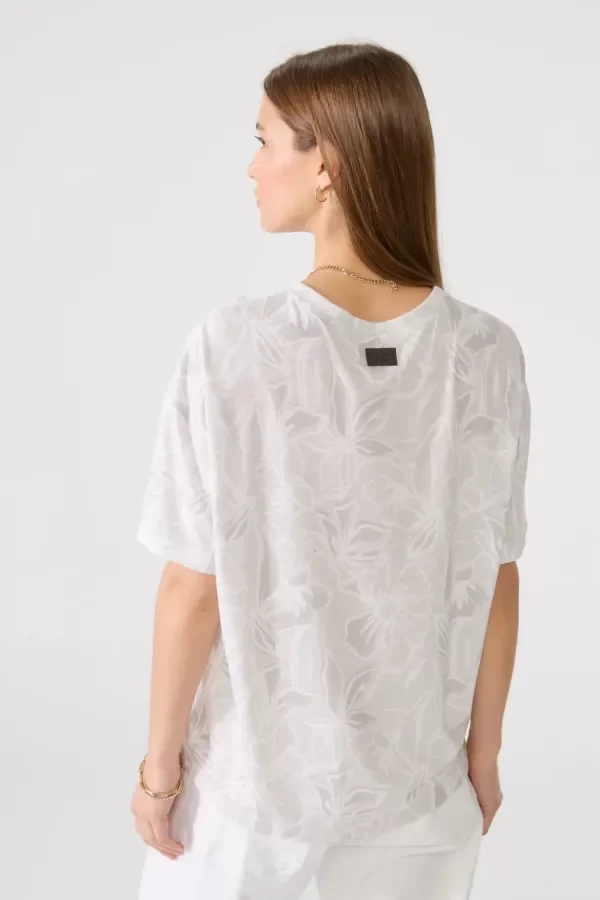 La Remera Tropical está confeccionada en jersey viscosa estampada, ofreciendo una textura suave y fresca ideal para los días cálidos. Sus sutiles tajos laterales en la parte inferior aportan comodidad y un toque moderno al diseño.