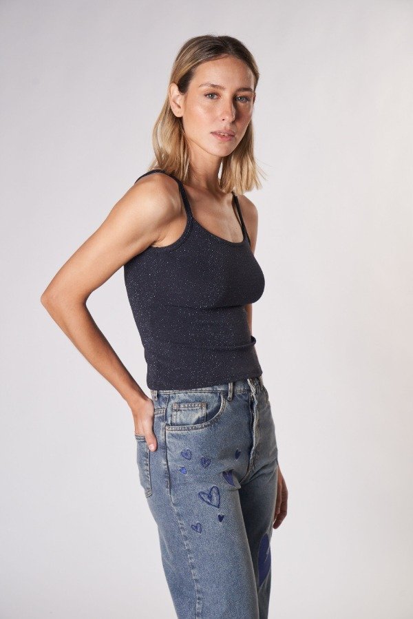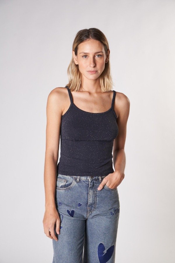 Musculosa confeccionada en tejido con lúrex. Breteles finos, escote redondo en delantero y espalda baja. Calce al cuerpo.