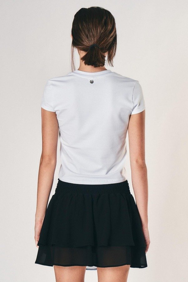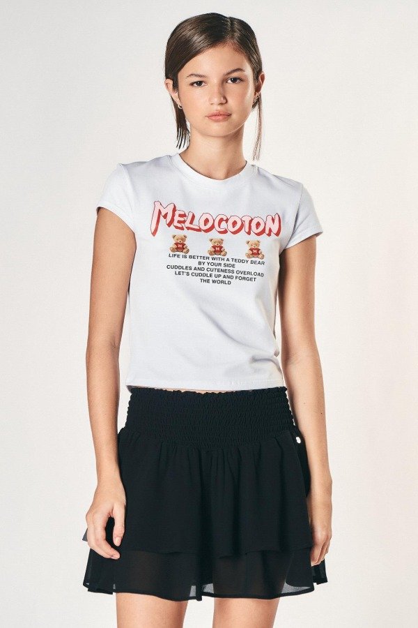 Remera confeccionada en tela de punto algodón con estampa posicional frontal exclusiva de la temporada. Calce relajado, escote redondo y mangas cortas.