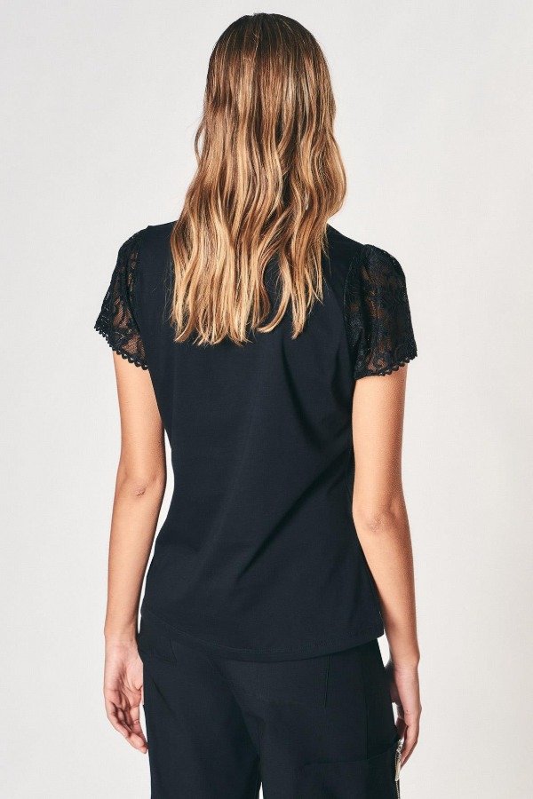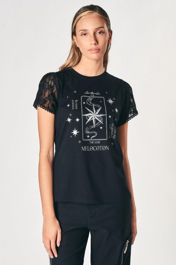 Remera confeccionada en tela de punto algodón con estampa posicional frontal exclusiva de la temporada. Escote redondo y mangas cortas en encaje.