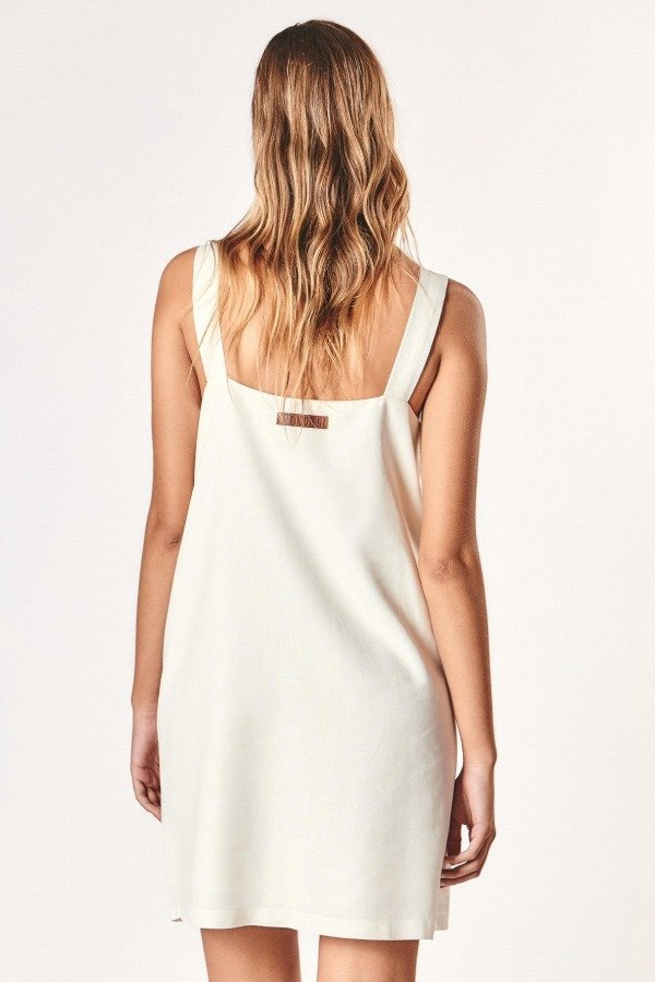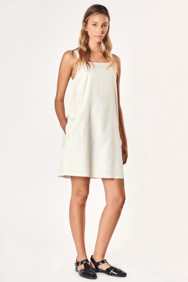 Vestido corto confeccionado en tela plana sedita twill, de silueta relajada. Escote recto y espalda amplia combinada con tiras anchas.