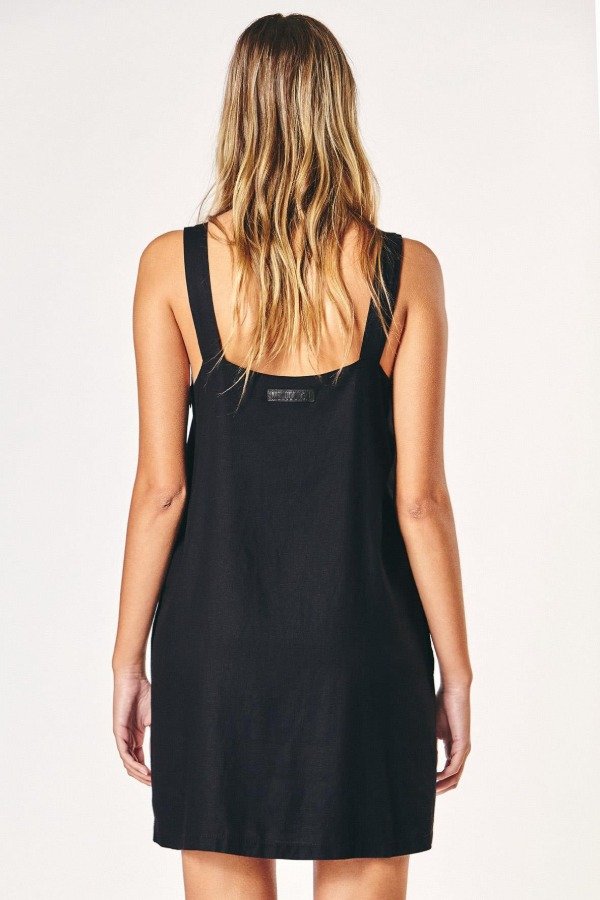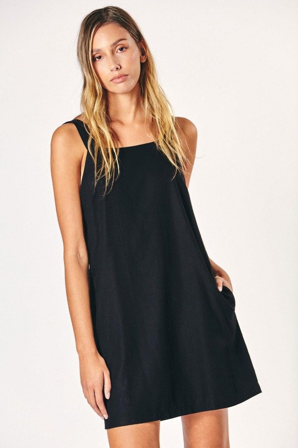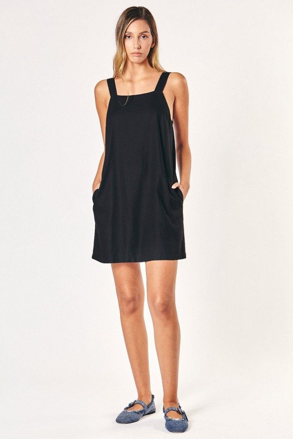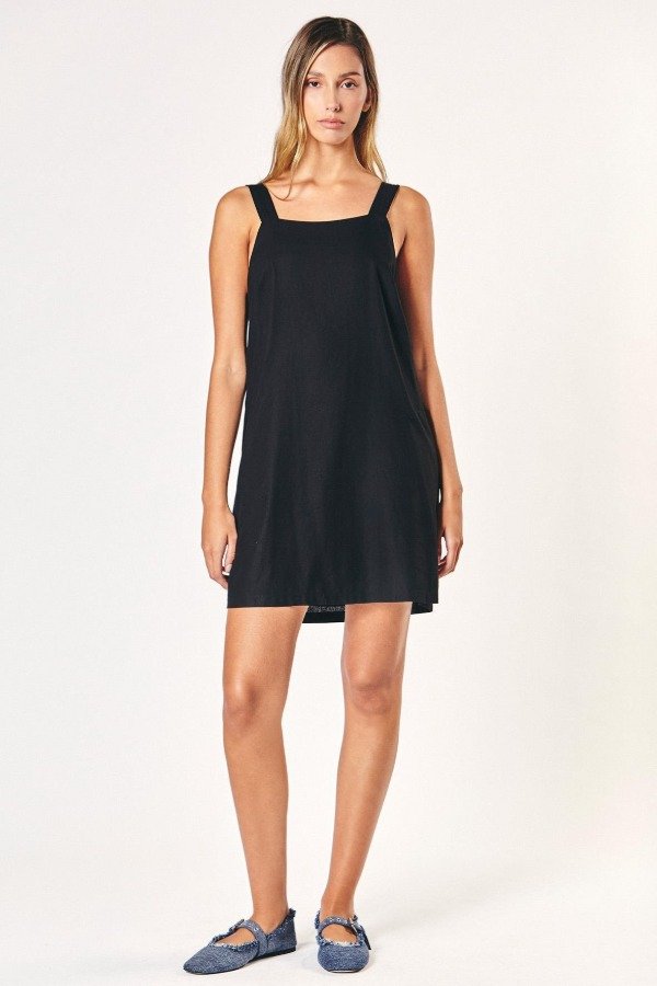Vestido corto confeccionado en tela plana sedita twill, de silueta relajada. Escote recto y espalda amplia combinada con tiras anchas.