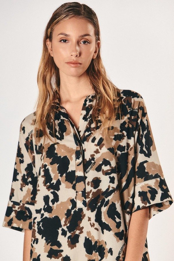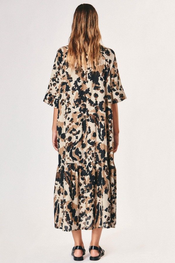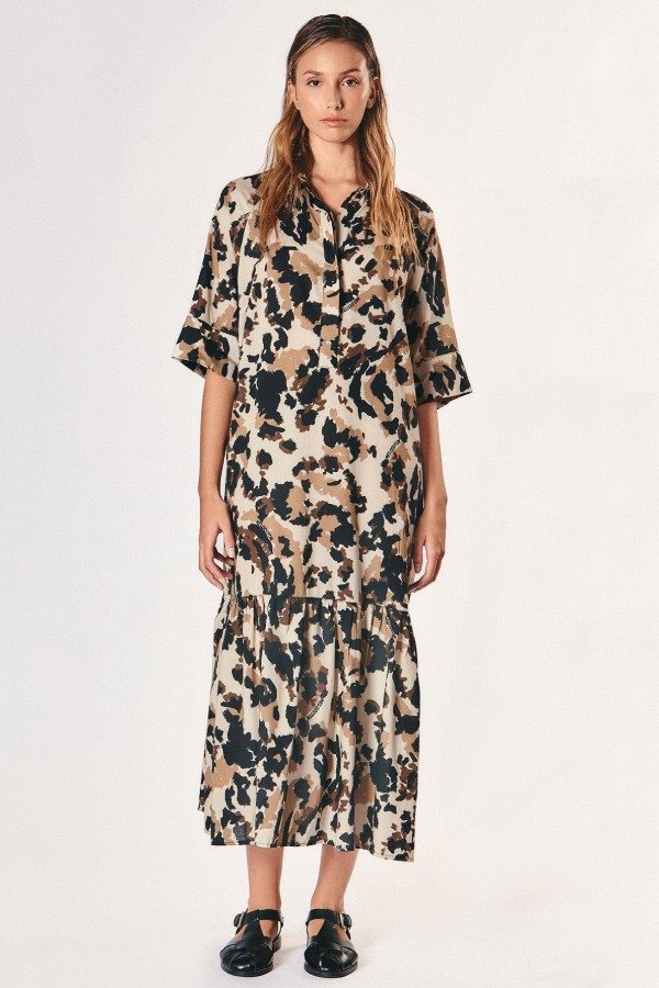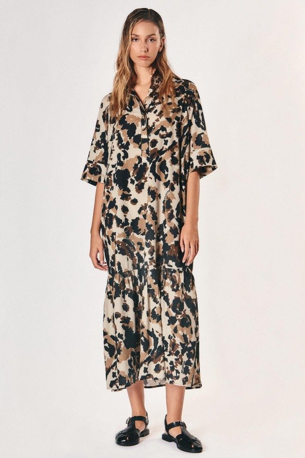 Vestido midi de silueta relajada con estampa full print excluisva de la temporada. Cuello camisero, mangas amplias tres cuartos y recorte con volado en la falda que suma movimiento.