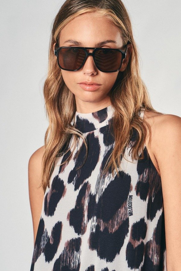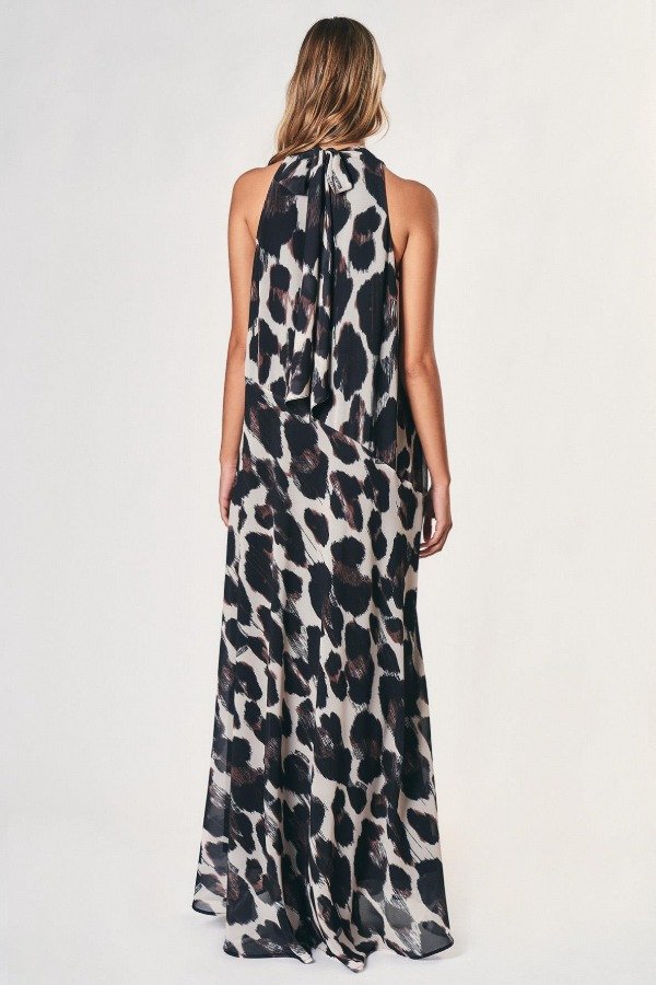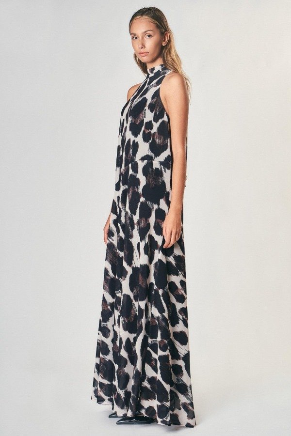 Vestido largo con silueta relajada y amplia. Cuello alto y escote en la espalda que se ajusta con lazo.