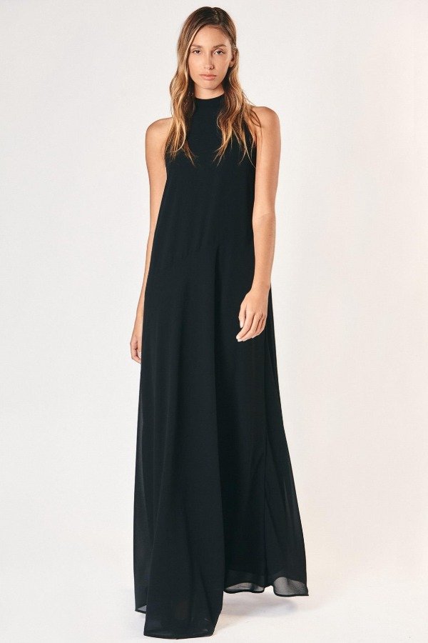 Vestido largo con silueta relajada y amplia. Cuello alto y escote en la espalda que se ajusta con lazo.